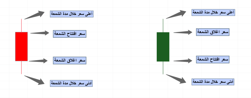 سعر الإفتتاح وسعر الإغلاق وأعلى سعر وادنى سعر وجميعهم خلال فترة الشمعة التي نحددها من خلال منصة التداول
