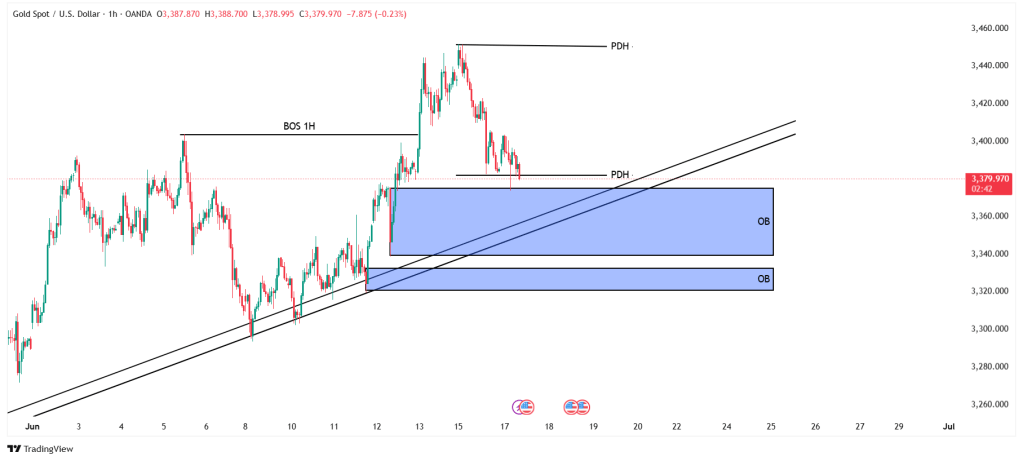 في الصورة اعلاه نرى اوردر بلوك على فريم 4 ساعات والذي يعتبر قويا ومتوافقاً مع 50 و61 فيبوناتشي والذي ننتظر منه ردة فعل صعودية على فريمات اصغر ويمكننا رؤية اوردر بلوك اخر بشكل اوضح على فريم 1 ساعة